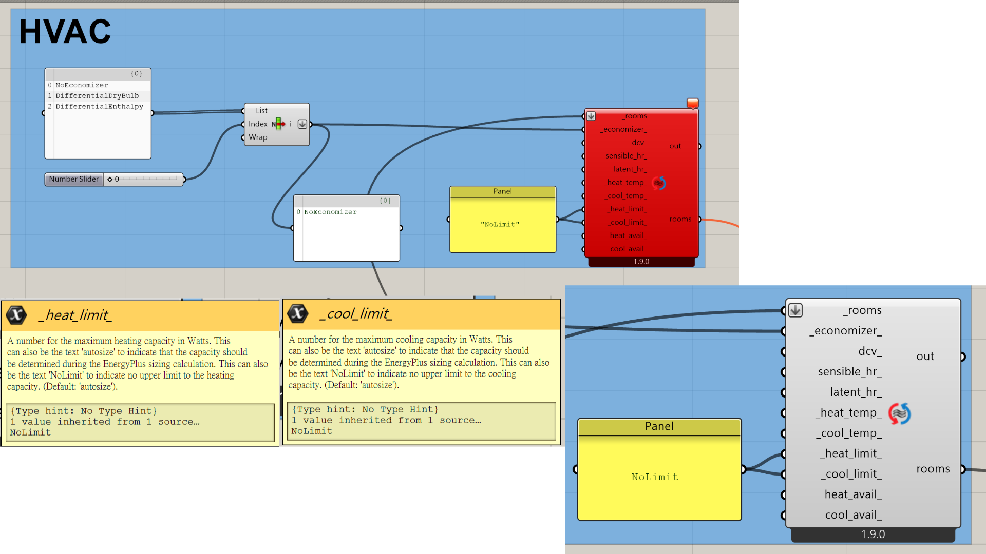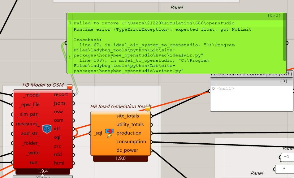 I’m using Ladybug Tools 1.9.0 with OpenStudio 3.9.0, and encountered an issue with the HB IdealAir component. According to the tooltip for the _heat_limit_ and _cool_limit_ inputs, it should be possible to input a string like "NoLimit" to remove the upper limit of heating/cooling capacity.