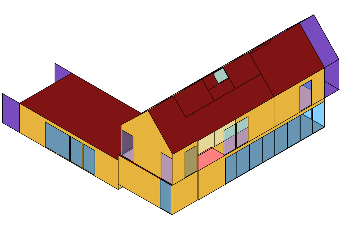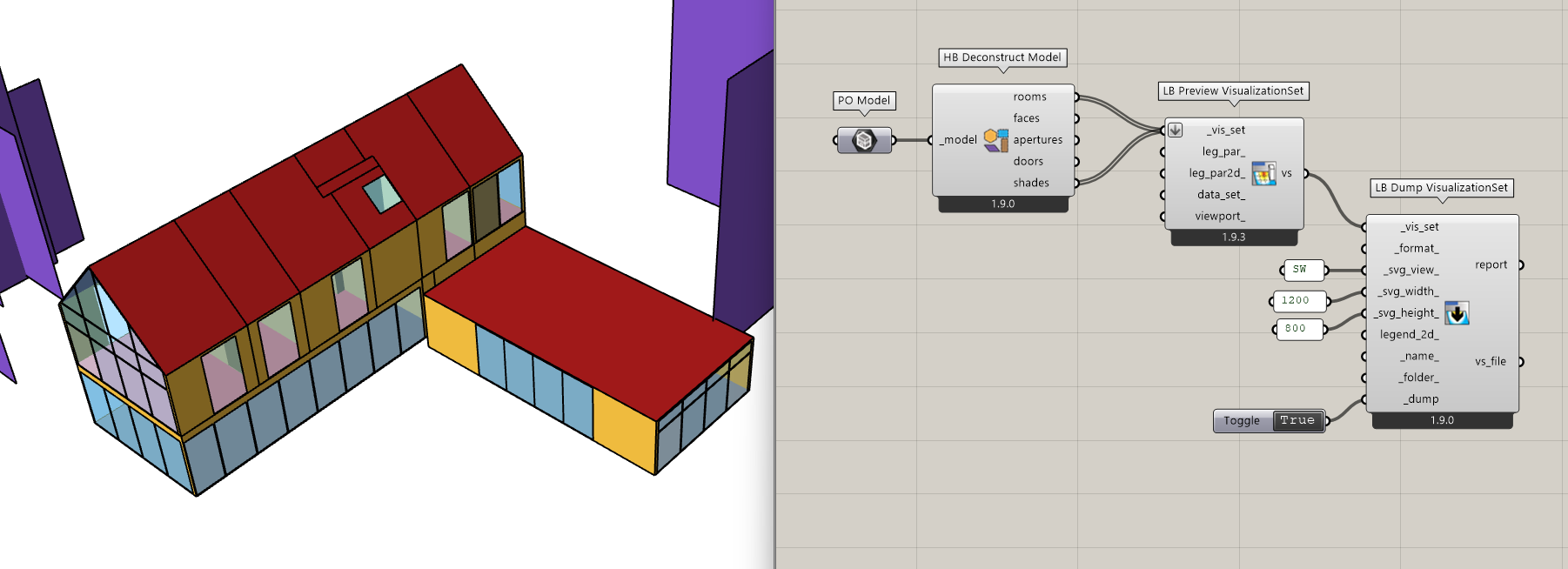 Essentially, the Model translation to VisualizationSet converts all of the geometry to DisplayMesh3D while the translation of individual Faces, Apertures, Room uses DisplayFace3D. If you can’t tell from the SVGs above, the DisplayFace3D option is much better suited to SVG and “Painter’s Algorithm” type of display than the mesh one, which is better for 3D viewers using “Z-Buffer” type of visualization. So, if you have to make a SVG of a Honeybee Model, I recommend deconstructing it and connecting the individual Honeybee Rooms and Shades like so: