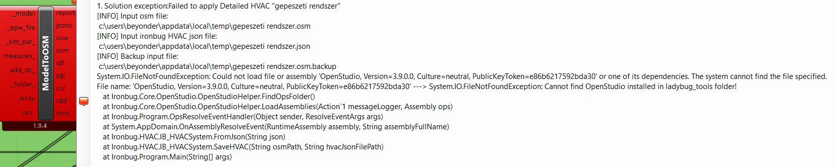 i cannot describe how frustrated i am because of this program group. you get a new error for every single thing you do and there is absolutely no correlation between the error message and what caused it. I managed to solve the previous problem by COMPLETELY reinstalling my computer. It was needed for a time now so i did. all worked fine until few days later i opened another sample file that i found on this forum and installed the absolutely same version of openstudio application that i had on this computer. now my file does not run AGAIN, an the error is “One or more errors occurred. (Failed to run OpenStudio CLI:)” I have three qualifications, two engineer and one programmer and still cannot guess what causes this problem. maybe because i copy-pasted one modul from the sample file? maybe the openstudio install? maybe there is a real problem with my ironbug scema? I am still new to grashopper but this is ridiculous.