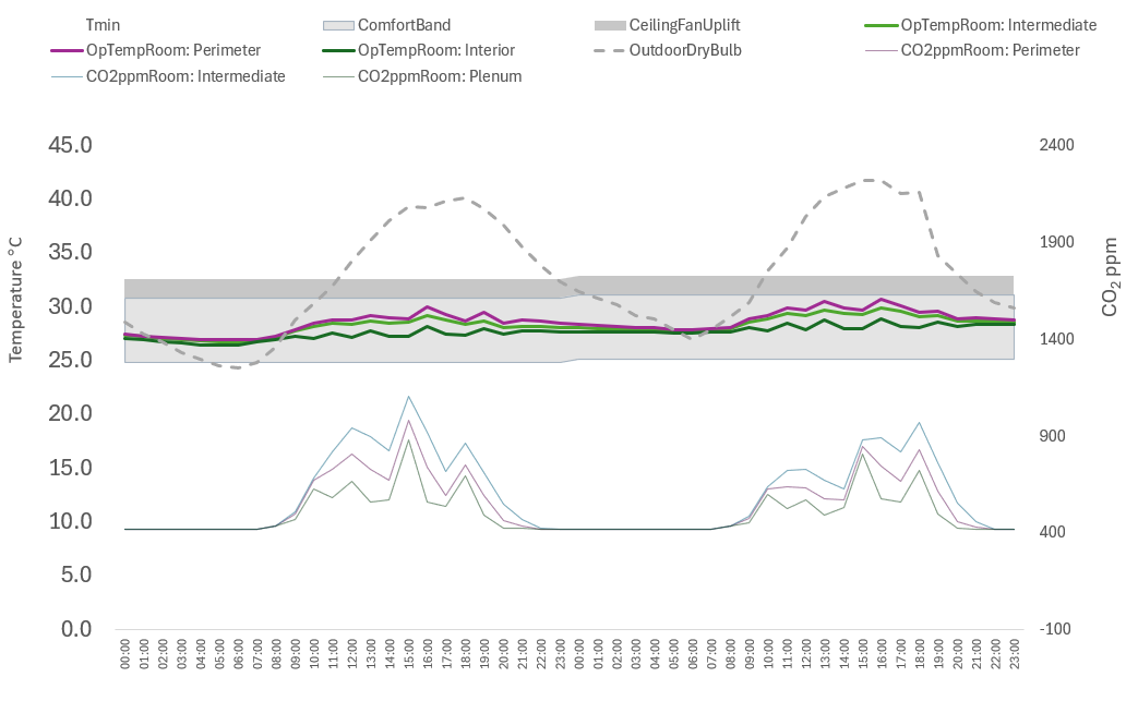The below graph shows two very hot days. The night purge works well, combined with thermal mass. However, you can see that the CO2 in the space is quite low during the hottest period of the day, since the vents are effectively fully open. What we would like is for the vents to optimize the space conditions, allowing the CO2 to rise, to say 1000ppm, keeping the windows shut to keep the heat out. The same for the winter, we need to allow the CO2 to rise on particularly cold days, and the windows partially shut so the air temperature is more finely controlled.