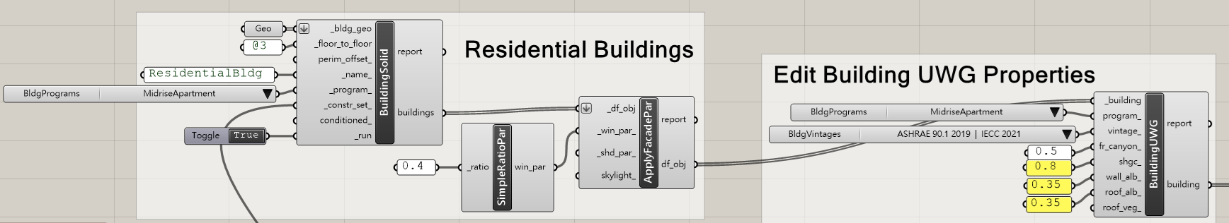 In the “Assign Building UWG Properties(BuildingUWG)” component, it is required to select one of the 16 reference building types for building program (for example MidriseApartment, LargeOffice).