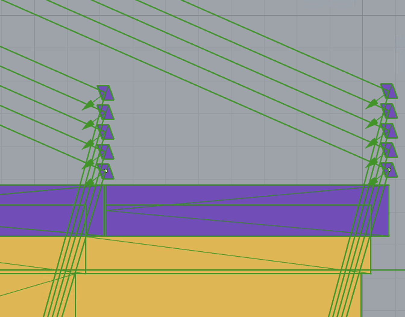 The reflectors ontop are constructed through the normal vector of the sunvector and the vector between the reflectors and an imaginary sonsor point on the sensor grid.