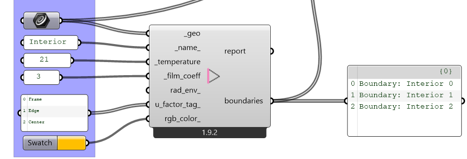 Another issue that your sample file got me to realize is that I was not using “Longest List” logic in the “FF Boundary” component. This was causing you to accidentally get 9 boundary objects when you connected 3 geometries and 3 u_factor_tags: