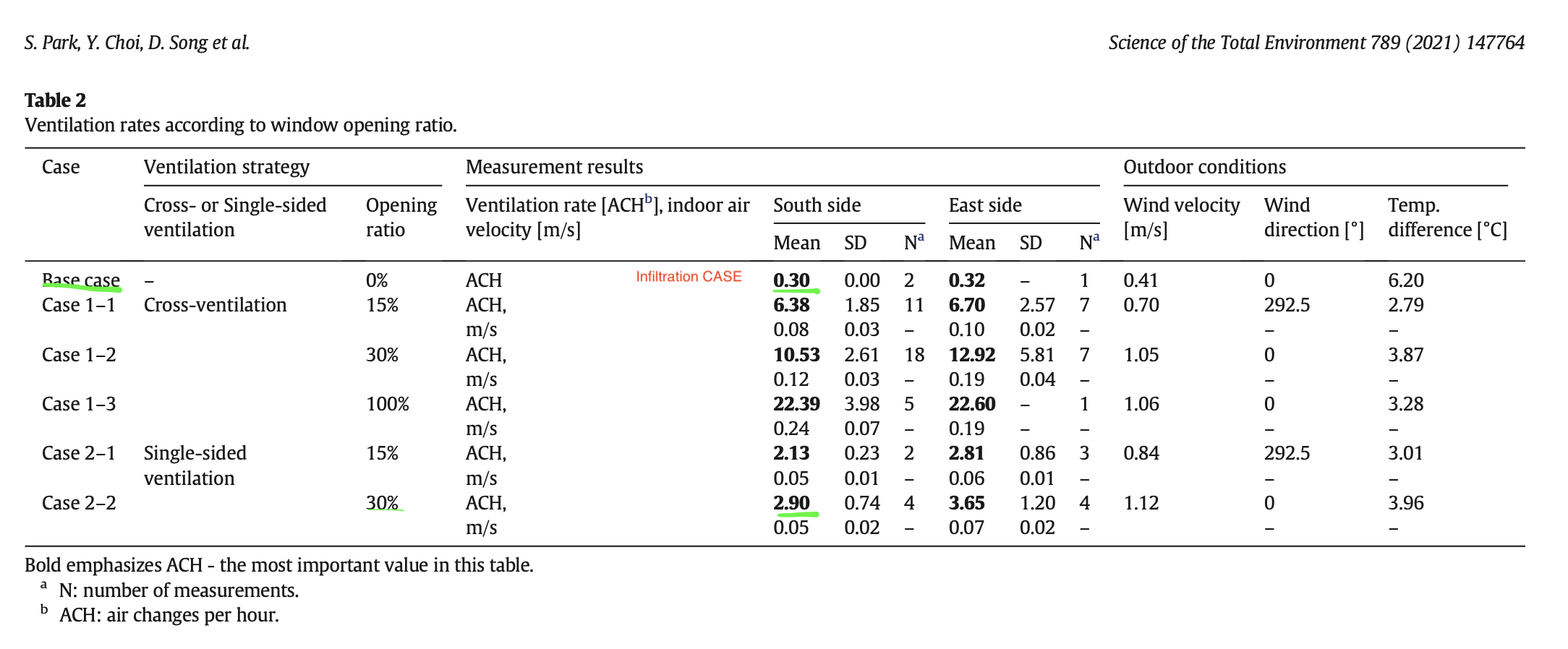 As a reference I have a research paper with specifically analysed the infiltration and ventilation rates of a exsisting classroom in south korea with the tracer gas method. So the results I have as an reference are measured in real life and not simulated. Link to paper: https://www.sciencedirect.com/science/article/pii/S0048969721028357?via%3Dihub