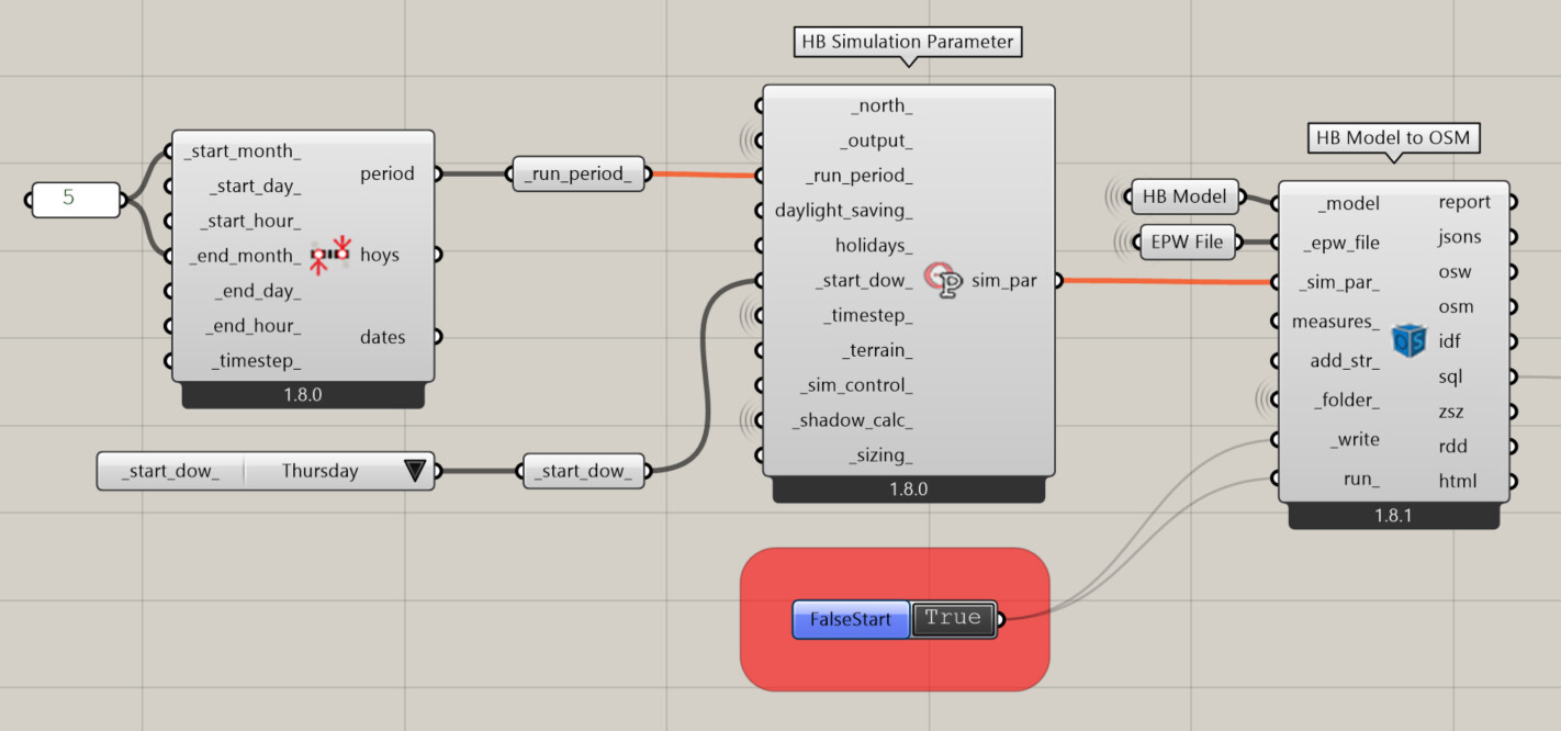 When setting both run_period and start_dow in the HB Simulation Parameter, the latter isn’t written correctly into the IDF. It seems Honeybee assumes the Start Day refers to January, picks a reference year that matches that condition, and then shifts the Start Day based on that year. But EnergyPlus wants the Start Day of the selected Run Period, not of the year.