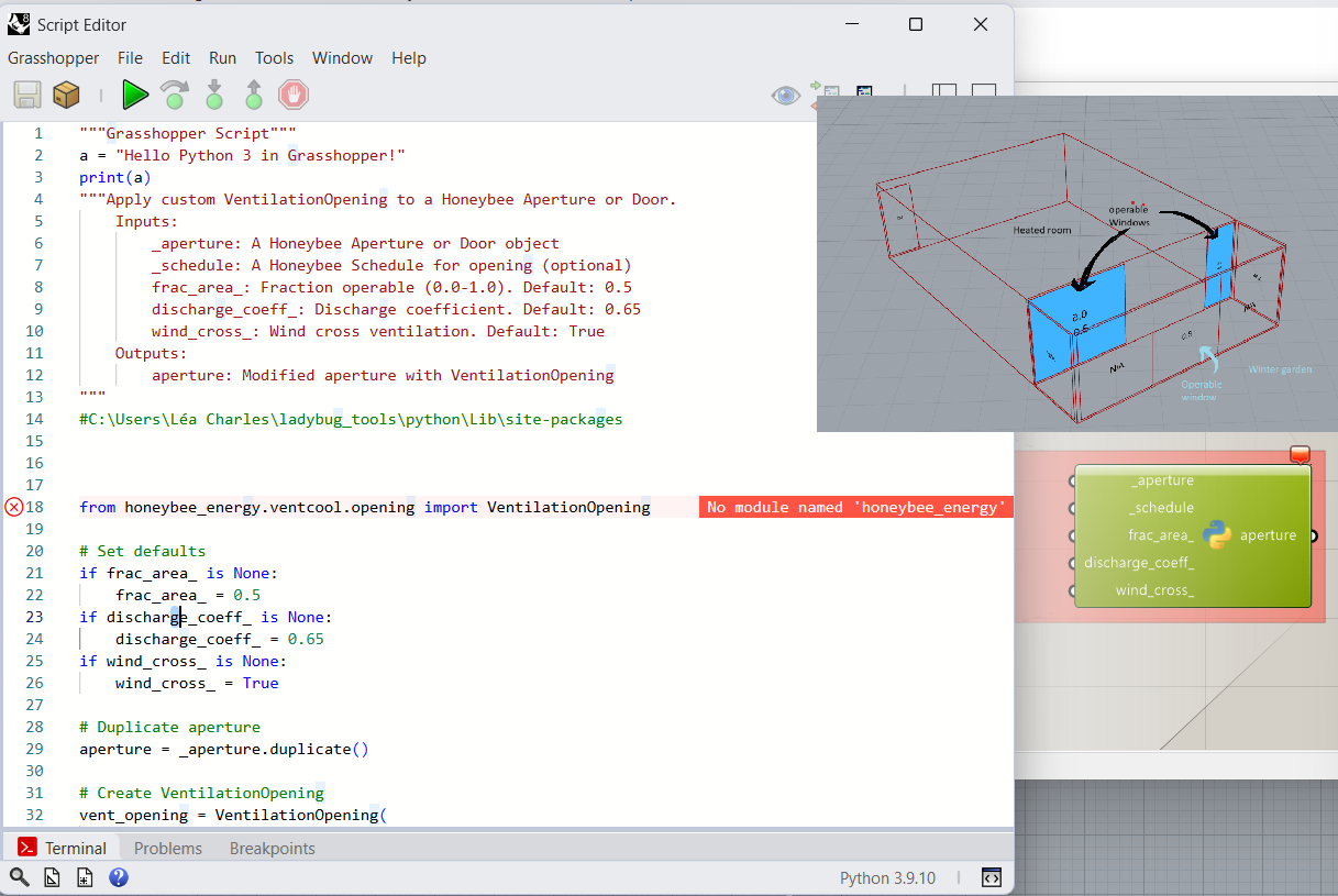 I tried to create a Python code with AI help for natural ventilation management. However, a “No module named honeybee_energy” error appears and I don’t know how to remove it. I have already reinstalled Ladybug Tools but the error persists.