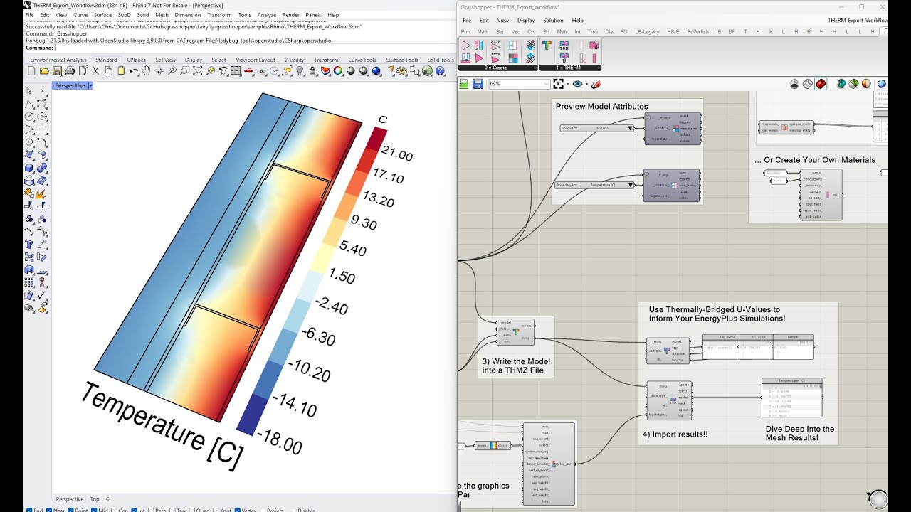 Thanks to a major refactor that LBNL performed for THERM 8.1, there is now only one file used by THERM to represent all model geometry, materials, simulation parameters, finite element meshes, and results - the THMZ file format. Unlike our Legacy THERM connection that used the older THMX file format, this new .thmz file is both the format that Fairyfly writes and the format used natively by the THERM interface. This all greatly simplifies many of the Fairyfly Grasshopper workflows, making it possible to write and read results from a .thmz file using Fairyfly even when you do not have THERM installed. Additionally, like LBT Honeybee, Fairyfly has components to serialize models to/from a JSON format such that you can save everything you build in Grasshopper to a single FFJSON file and load up the exact same model object in a different Grasshopper definition with zero data loss.