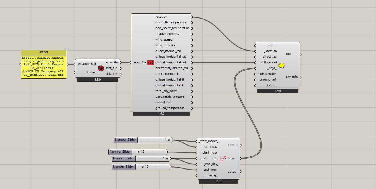 I’ve been using Ladybug Tools for solar simulation, and it was working fine two months ago. However, I’m currently facing issues with running the simulation and obtaining solar incident radiation results. I’ve attached my simulation flowchart for your reference.