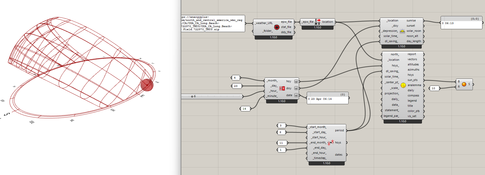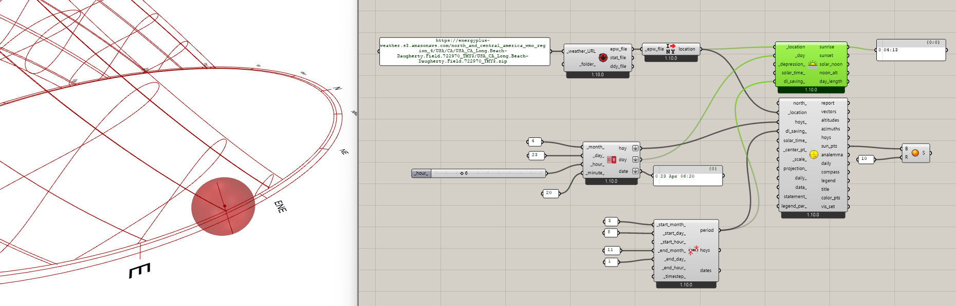 However, for components that output datetimes like the the LB Day Solar Information component, it is treating the output time as if it were an input in daylight time - shifting the input backwards to try to coordinate it with standard time rather than shifting it forwards as it should be. I can see this pretty clearly if I recreate the sunrise that happened in my part of the world today a little bit before 6:20 AM Pacific Daylight Time: