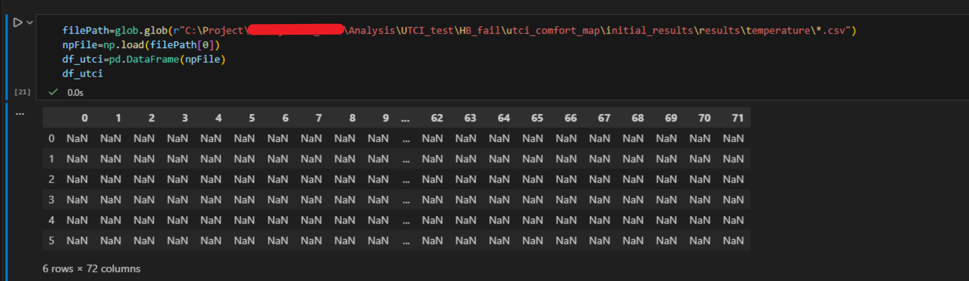 I am trying to use the UTCIMap component (v1.9.0) to resolve the UTCI spatially for a sample project site. However, I find that whenever my analysis period is less than a month, the simulation runs but gives NaN values. However, if it is over a month, the results are normal. I have uploaded a screenshot showing the successful results’ visualisation, as well as two screenshots of the failed results’ error and NaN values.