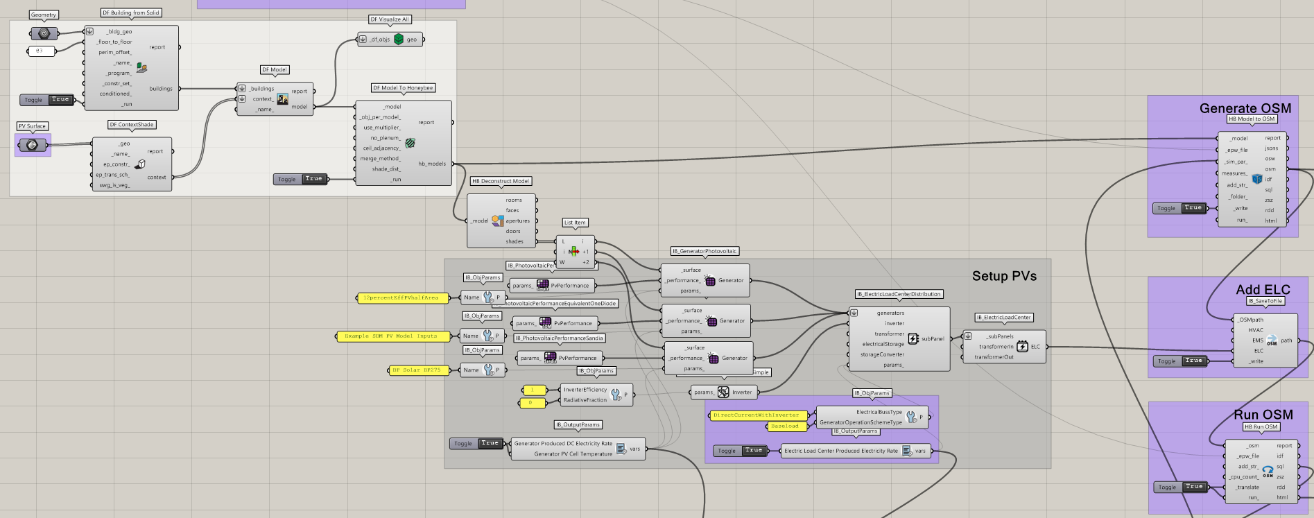 The building envelopes and HVAC systems can be developed in either Dragonfly or Honeybee; however, the main challenge lies in integrating the PV systems (or solar collectors).