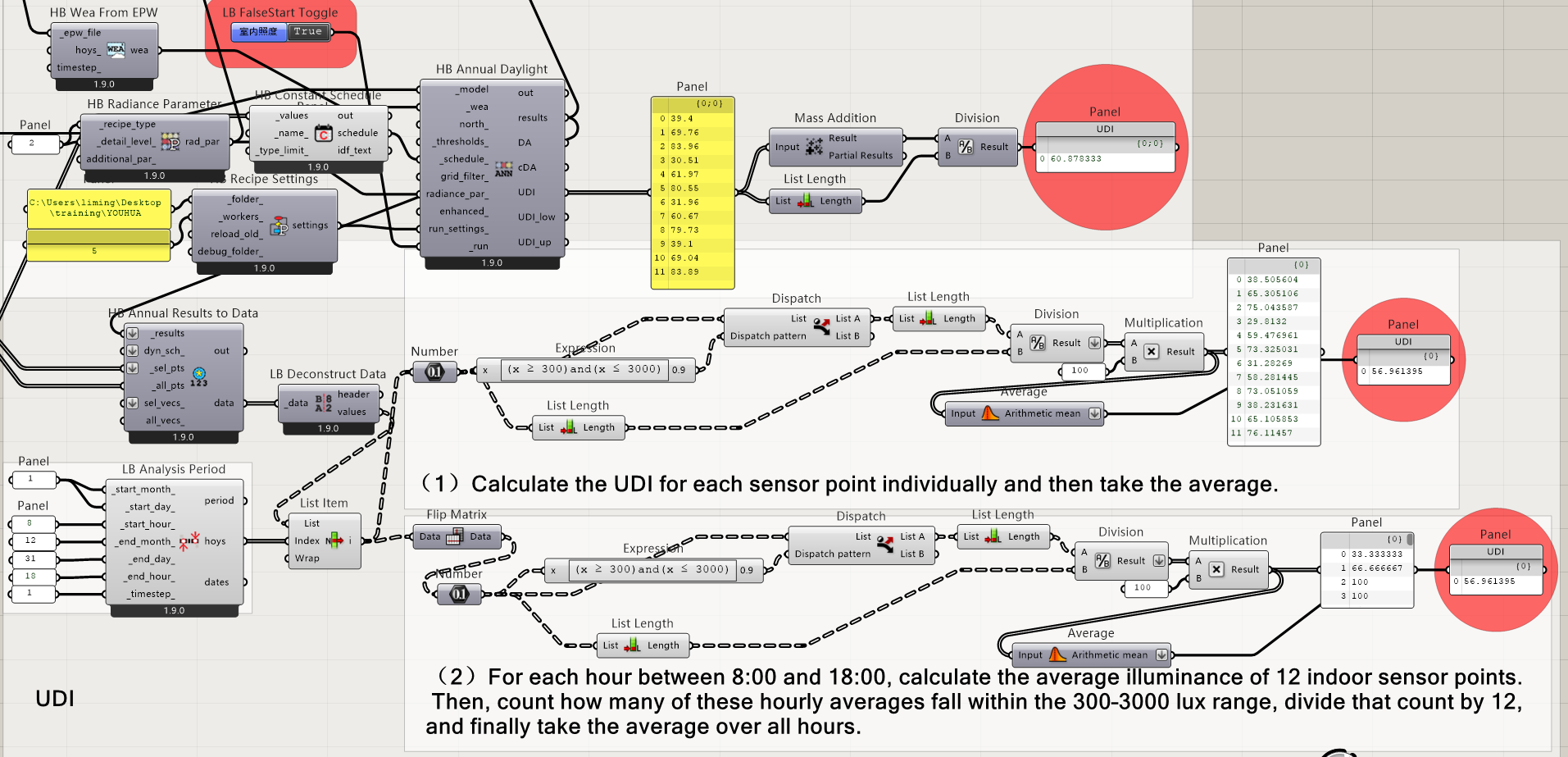 When I try to extract the hourly illuminance values to manually calculate the UDI, the results are quite different from those given by Honeybee. I’ve tested two approaches: