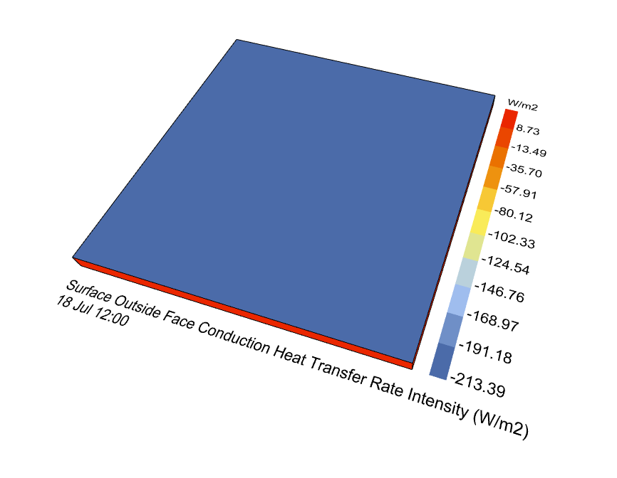 In the results, I obtained 34 surfaces. The roof surface on the top of the HB Room is what I consider to be the road surface. Only this surface shows temperature variations, while all the other surfaces remain constant at 18°C at all times.
