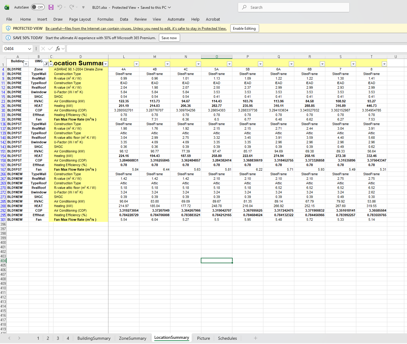 You can see that they each have a spreadsheet showing properties of constructions for each of the different ASHRAE climate zones and the 3 types of vintages the UWG supports: