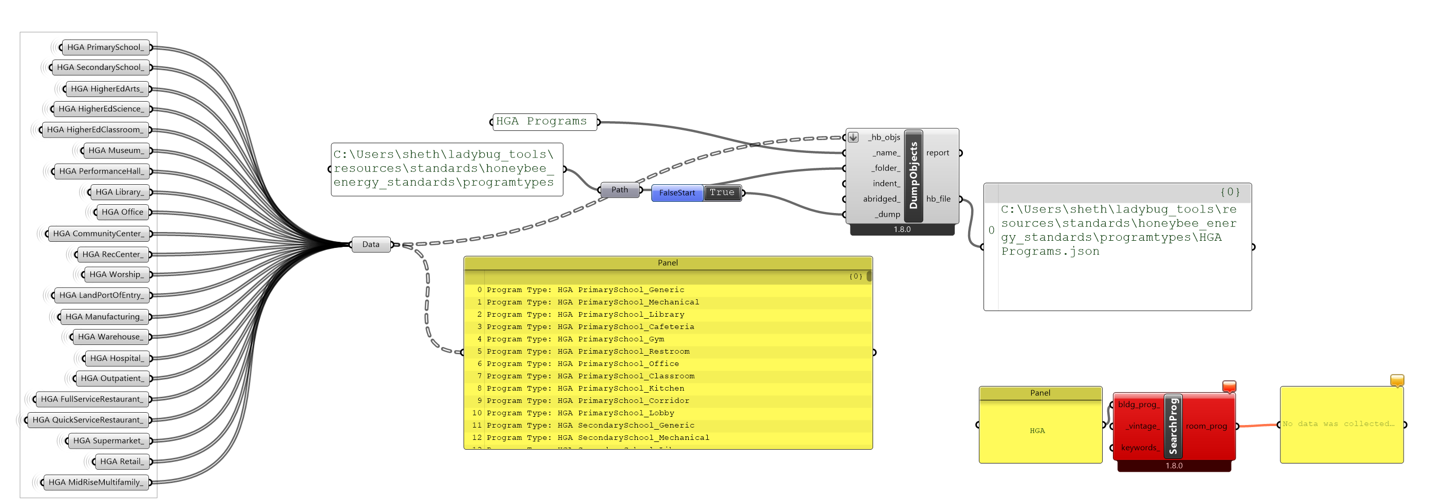 We are able to create a custom program types .json file and successfully ‘Dump’ it to the Honeybee Energy Standards > Program Types folder. These custom programs can be found when searching using the ‘SearchPrograms’ ’ component.