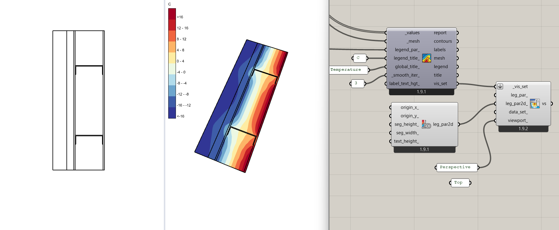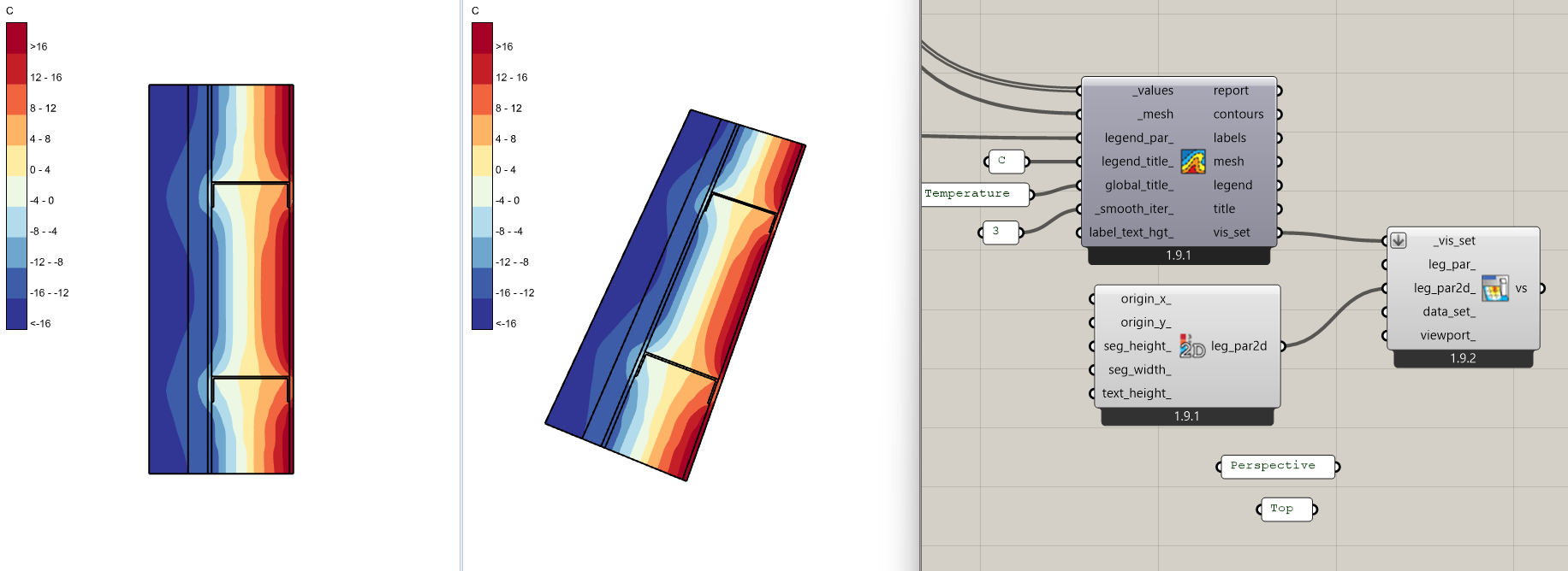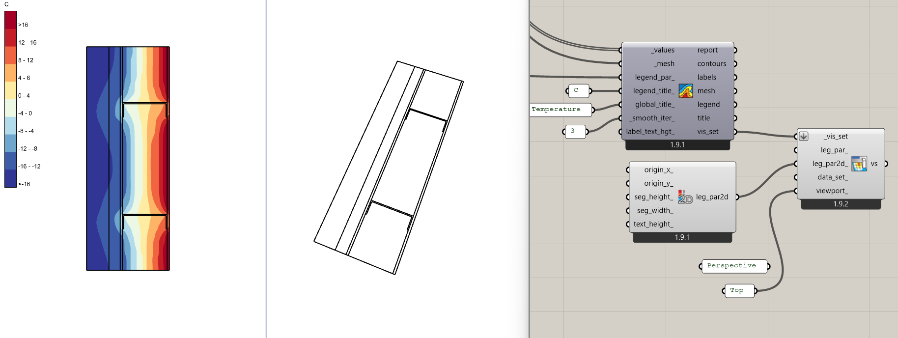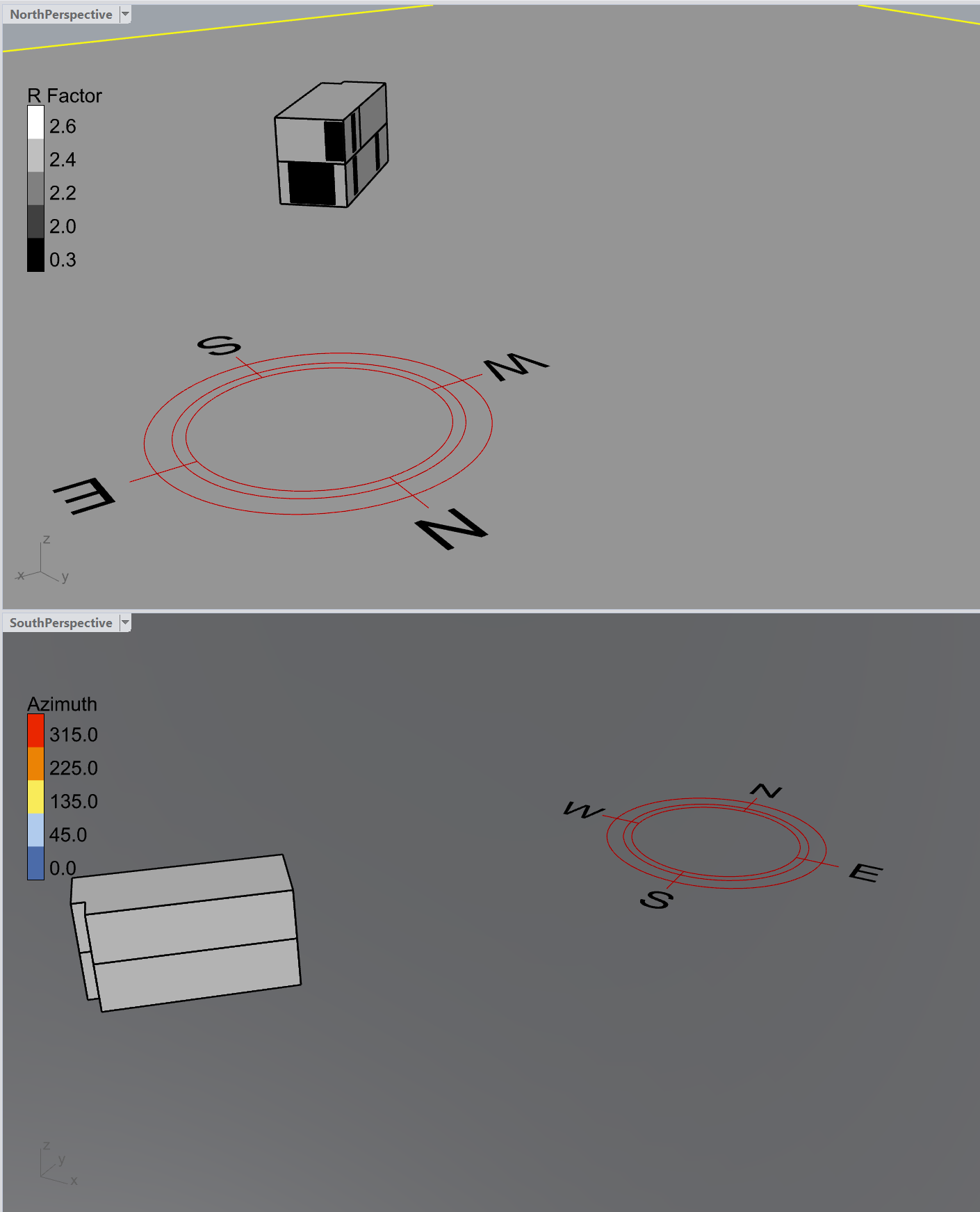 The goal is to capture at least 2 graphs with parallel to the screen annotation using the Fly component, which your viewport specification for Visualisation Sets manages beautifully. I would like to have the same control over the 2Dtext component. In the following two graphs, I would like the perspective to show the R-values for the (simplistic) model, but I would like to add the Heating and Cooling EUi and total via 2DText above the Energy Balance Graph. At present, such annotation appears in both windows!