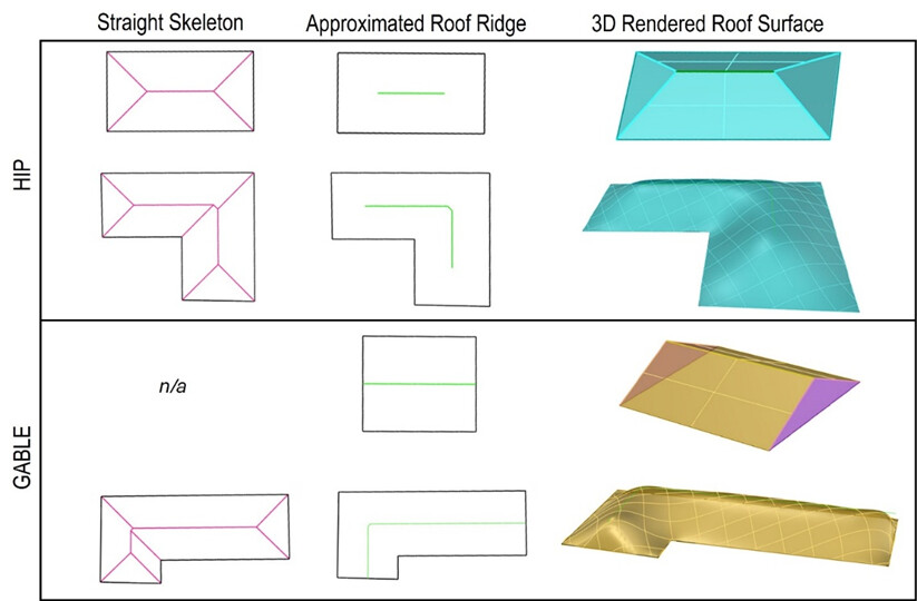 The script approximates 3D roof geometries using 2D building footprints plus LiDAR data used to extract eaves-to-peak roof heights, as well as a tool within ArcGIS to classify roof types (gable, hip, or flat).