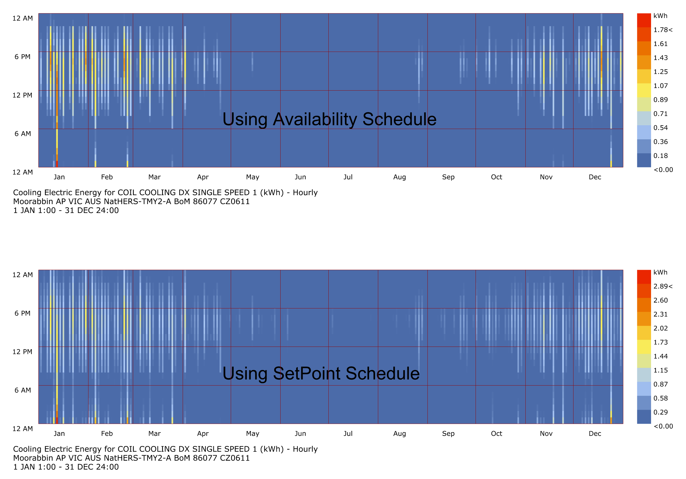 I also see that in the second case, there seems to consistently be a sudden increase in cooling at 8am. This is not due to occupancy, since if I set a constant occupancy schedule this cooling pattern remains. I am wondering if there is a cooling setback being defined somewhere in the background, and if so, how I overwrite it?
