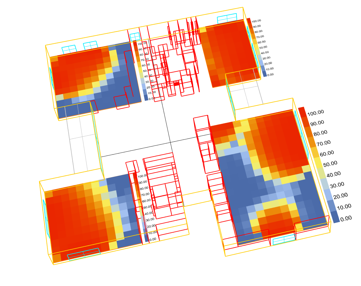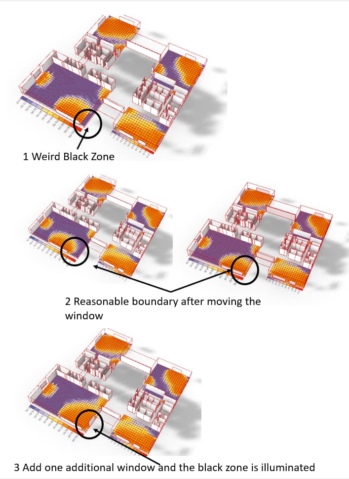 I got one weird daylighting simulation result after I build this simple test model. I have shown the result below. My query is how the weird black zone appear and disappear in different condition. Is it a BUG of the new version? Or did I make some mistakes?