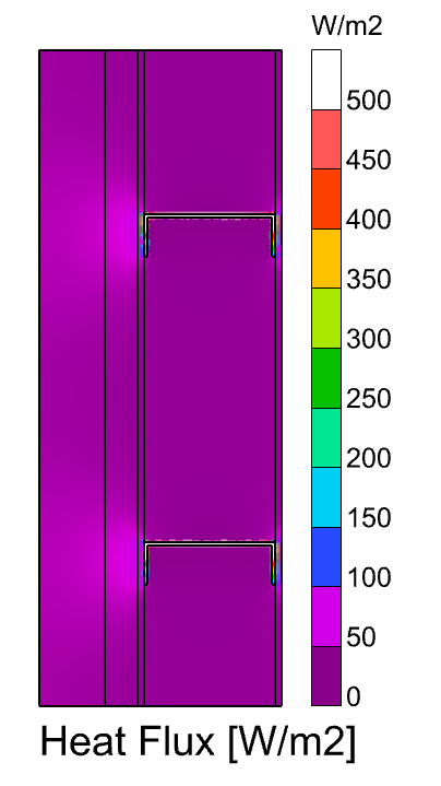This helps you highlight where in the model you are loosing the most heat (aka. where the U-Value is worst). In the screenshot above, this is clearly mostly through the steel studs. However, you can also appreciate that there is a bit higher heat flow that happens where the steel studs attach to the rest of the construction.