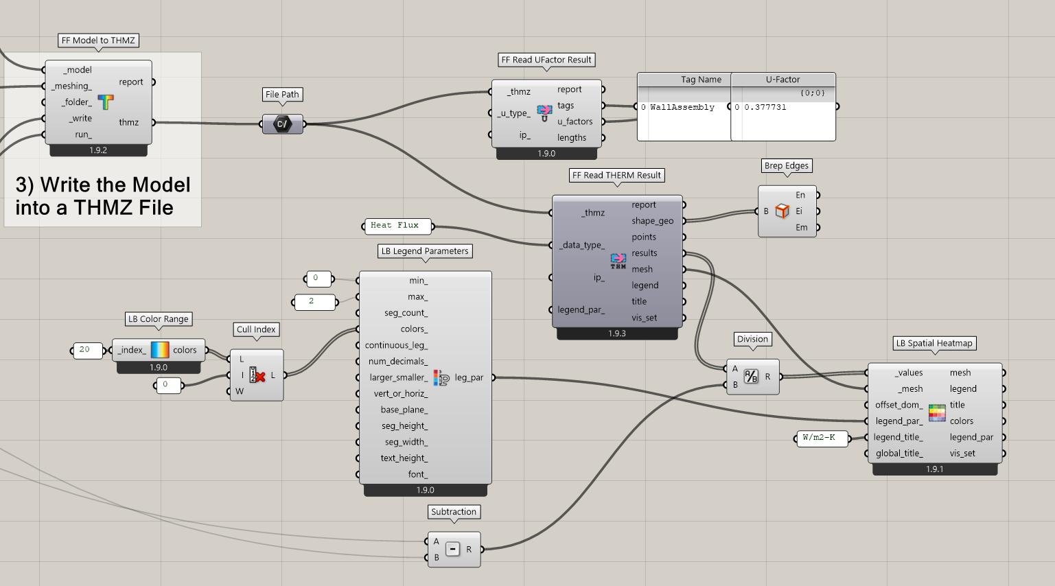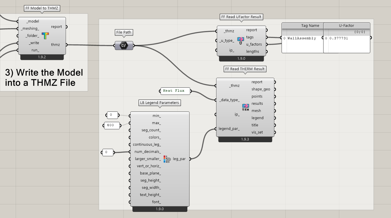 Now that I know what you are trying to communicate, I have a suggestion, which might be a more effective way to explain that “the performance is not the same everywhere” while also giving a more complete view of the “performance” over the whole construction. Instead of trying to give a single number for U-Value at a point along the edge of the model, you can use the “FF Read THERM Result” component to import a colored mesh of the Heat Flux (in W/m2) like so: